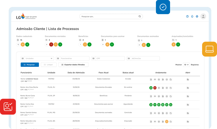 Com o Admissão Digital da LG lugar de gente, o RH elimina tarefas manuais, centraliza documentos e garante uma experiência de integração moderna e sem falhas. A solução simplifica etapas, aumenta a conformidade e acelera o início da jornada do colaborador.