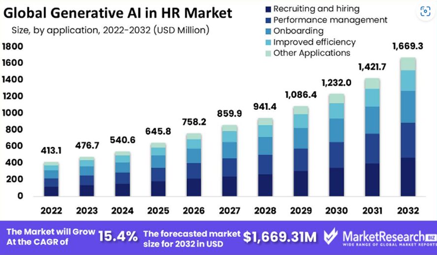 Segundo o relatório Market Research, realizado em 2022, o tamanho do mercado IA generativa em RH valerá cerca de USD 1669.3 M até 2032, crescendo cerca de 15.4% durante o período de de 2023 a 2032.
