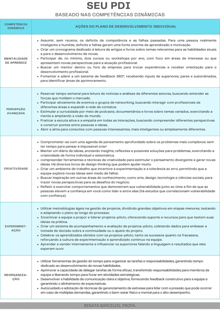 Com base no conceito de Competências Dinâmicas proponho um modelo de PDI que visa a equipar os gestores com as ferramentas necessárias para navegar com sucesso no cenário empresarial de 2025 e além. O detalhamento das ações para cada tipo de competência está no quadro 1, veja a seguir:
