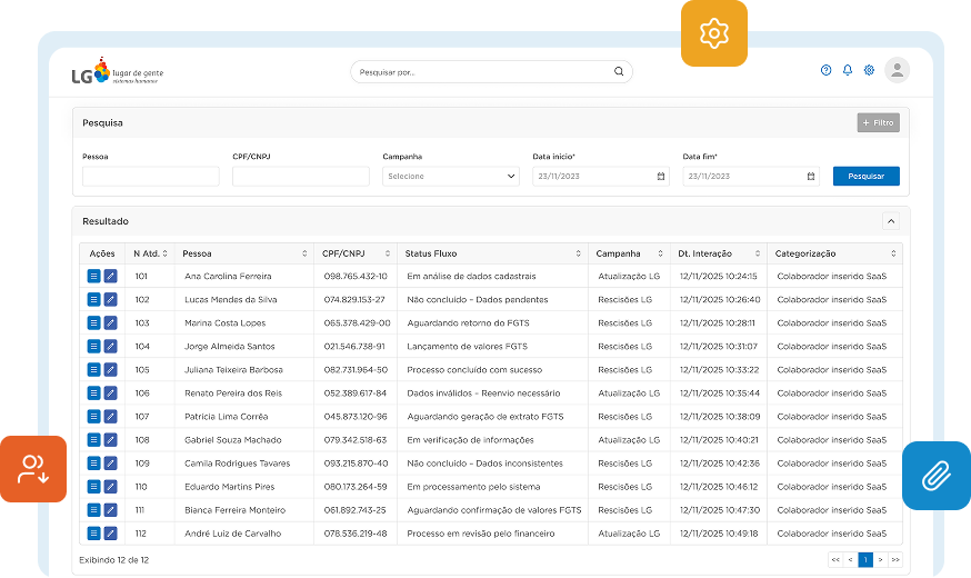 Com a Automação de Consulta FGTS da LG lugar de gente, o RH e o Financeiro passam a contar com um robô (RPA) que realiza, de forma automática, a consulta e consolidação dos saldos de FGTS diretamente nos portais da Caixa. O acesso é seguro via certificado digital ICP-Brasil ou credenciais e as informações são atualizadas periodicamente, garantindo conformidade, precisão e previsibilidade de caixa.