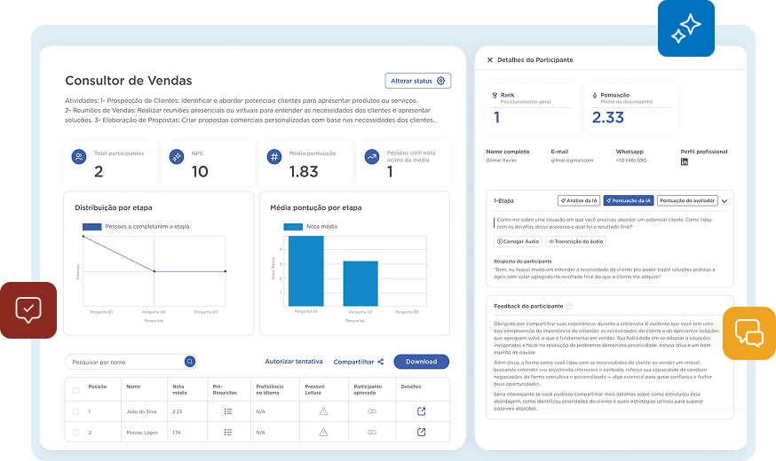 Escale as entrevistas iniciais com inteligência artificial que conduz conversas por voz, identifica padrões de linguagem e gera insights para seleção.